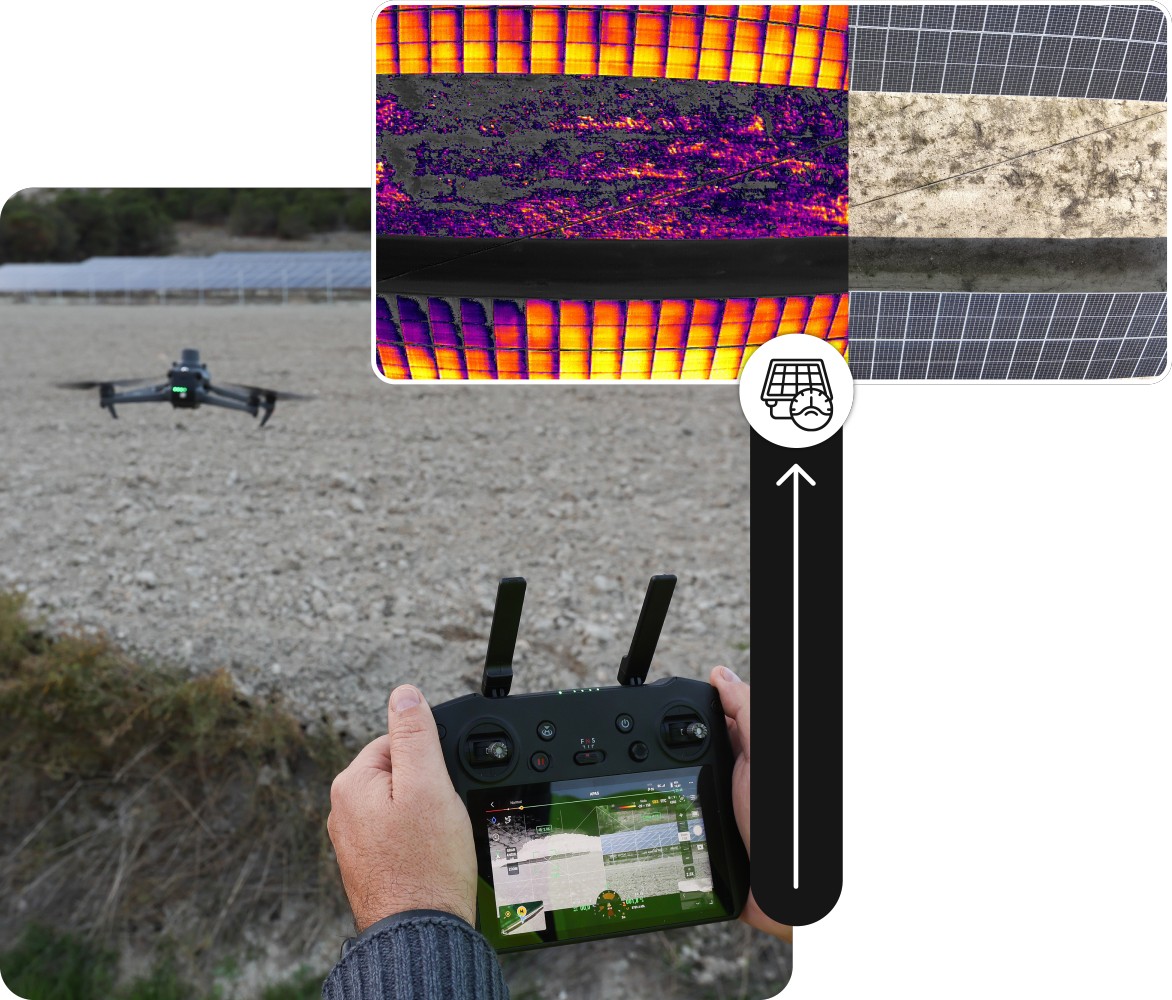 Es una primera inspección en la que el dron sobrevolará tu huerto solar y realizará fotografías en RGB (fotos normales) y fotografía térmica.